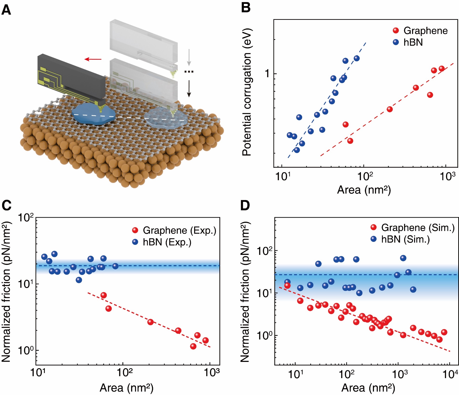 在此基础上,研究人员进一步突破了传统扫描探针显微镜无法对大面积弱键体系进行可控操纵的瓶颈,通过对针尖尖端形状的精准调控,发展出了一套二维冰岛(水分子数>20000)的非破坏式操纵以及本征摩擦力测量的新方法(图4)。实验结果表明,石墨烯表面二维冰的面积归一化摩擦力随冰岛总面积的增大而减小,在实验可测量的面积范围内最终减小到1pN/nm2,拟合的衰减系数约为-0.5,符合超润滑所预期的摩擦特性;而氮化硼表面二维冰的归一化摩擦力与冰岛的面积无关,为一常数(约18 pN/nm2),因此总摩擦力随着二维冰面积的增大而线性增大,属于传统的摩擦行为。