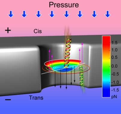 在以上工作基础上,课题组还系统研究了DNA穿孔时间随压强的变化依赖关系;压强和纳米孔大小对区分不同长度DNA分子的影响;建立了一整套完备的DNA在纳米孔中的受力模型,很好解释了实验结果