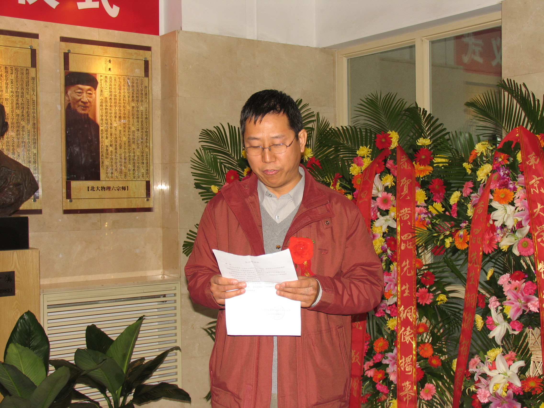 仪式上,黄昆先生当年的研究生秦国刚院士介绍了黄昆先生生平和主要成就。黄昆先生是世界著名的物理学家,他对固体物理学作出了许多开拓性的重大贡献,是我国固体物理学和半导体物理学的奠基人之一。黄昆先生一贯强调德才兼备,教书与育人相结合的教育原则,呕心沥血,教诲提携,以极大精力投入为国家培养科技人才的光荣事业,认为在中国培养一支科技队伍的重要性远远超过他个人在学术上的成就,堪称中国科学界的典范。黄昆先生为我们留下的不仅是一些举世瞩目的科学成果,还有在科学研究上不断创新、勇于探索的精神;不仅是一批批他所培养的科技事业的栋梁之才,还有严谨求实的治学态度和淡泊明志的高尚情操。他对祖国的赤子之情,对事业的赤子之诚,对党的赤诚之心和高尚的情操将垂范世人,启迪后学。秦国刚院士最后说, 作为黄昆先生的弟子,我们深切怀念这位半导体科学技术界的一代宗师和长期培养教诲我们中许多人的恩师,我们将沿着黄昆先生的足迹,在教学革命和推进科技进步的道路上阔步前进!
