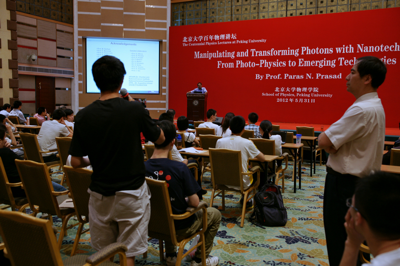 美国纽约州立大学布法罗分校杰出教授Paras N. Prasad博士应邀做了题为“利用纳米技术控制和变换光子——光物理的技术革新”的学术报告。报告会由JDB电子娱乐官网副院长龚旗煌教授主持。JDB电子娱乐官网院长谢心澄教授向听众介绍了Prasad博士,并为Prasad博士颁发了“JDB电子娱乐官网百年物理讲坛”的纪念品。JDB电子娱乐官网师生与来自北大其它院系、清华大学、中国科学院等单位的近200名师生在现场聆听了Prasad博士的精彩报告,并在会后与Prasad博士进行了充分的学术交流。