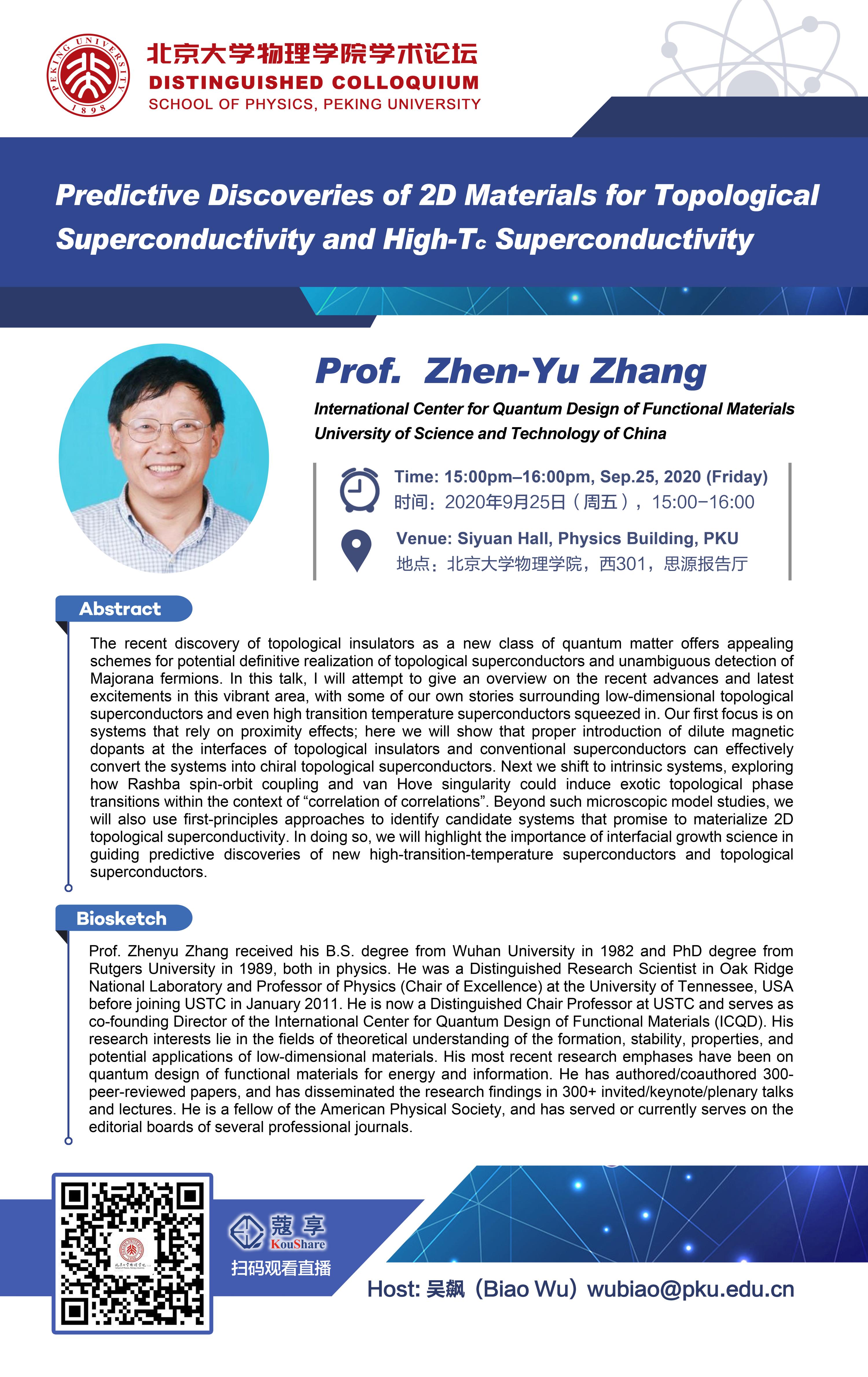 Prof. Zhenyu Zhang received his B.S. degree from Wuhan University in 1982 and PhD degree from Rutgers University in 1989, both in physics. He was a Distinguished Research Scientist in Oak Ridge National Laboratory and Professor of Physics (Chair of Excellence) at the University of Tennessee, USA before joining USTC in January 2011. He is now a Distinguished Chair Professor at USTC and serves as co-founding Director of the International Center for Quantum Design of Functional Materials (ICQD). His research interests lie in the fields of theoretical understanding of the formation, stability, properties, and potential applications of low-dimensional materials. His most recent research emphases have been on quantum design of functional materials for energy and information. He has authored/coauthored 300- peer-reviewed papers, and has disseminated the research findings in 300+ invited/keynote/plenary talks and lectures. He is a fellow of the American Physical Society, and has served or currently serves on the editorial boards of several professional journals.